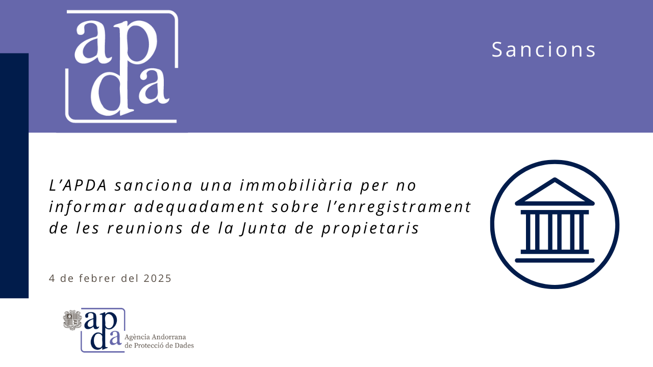 D’acord amb el que disposa la Llei 29/2021, del 28 d’octubre, qualificada de protecció de dades personals, s’informa que el responsable del tractament és l'Agència Andorrana de Protecció de Dades, amb domicili a C/ Dr. Vilanova, 15-17 Nova seu del Consell General, planta -5, AD500 Andorra la Vella i al telèfon +376 808 115. Podeu contactar amb el Delegat de protecció de dades dirigint-vos a dpd@apda.ad.